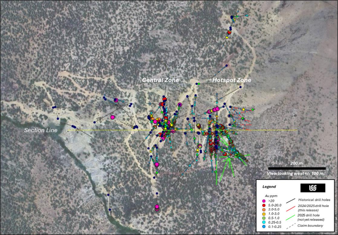 Figure 1. Plan map of the Lapon Gold deposit, showing the Central and Hotspot zones with historic and 2025 drilling results.